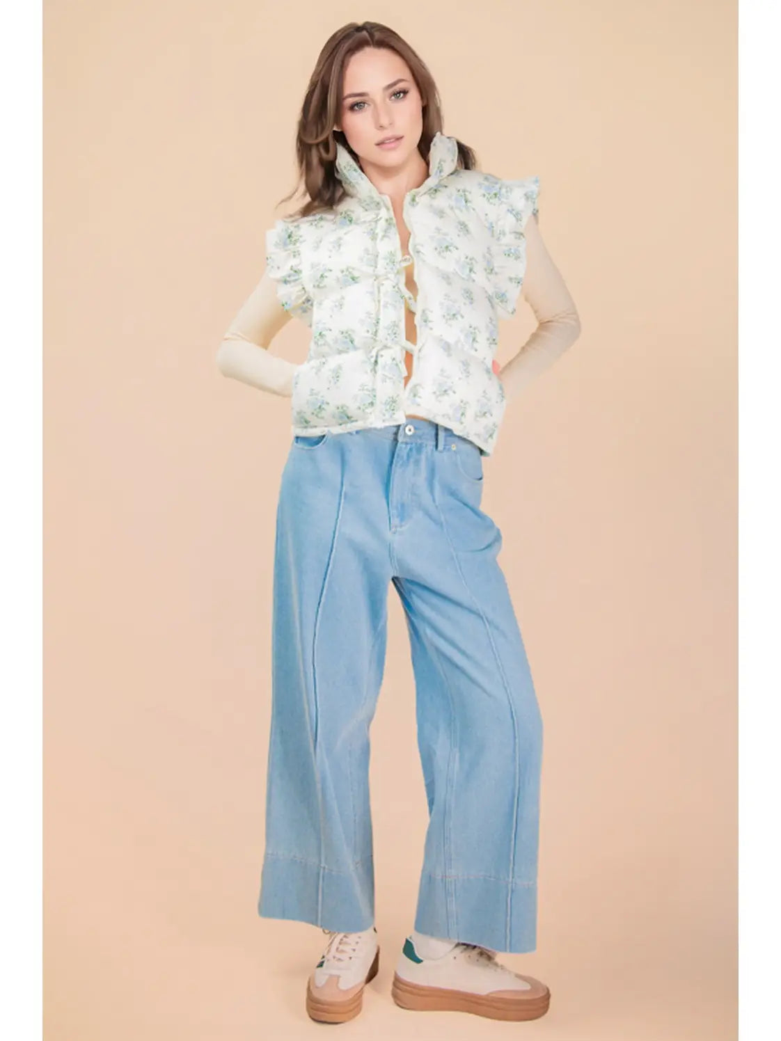 Women’s Floral Ruffle Puffer Vest – Lightweight Quilted Tie-Front Jacket